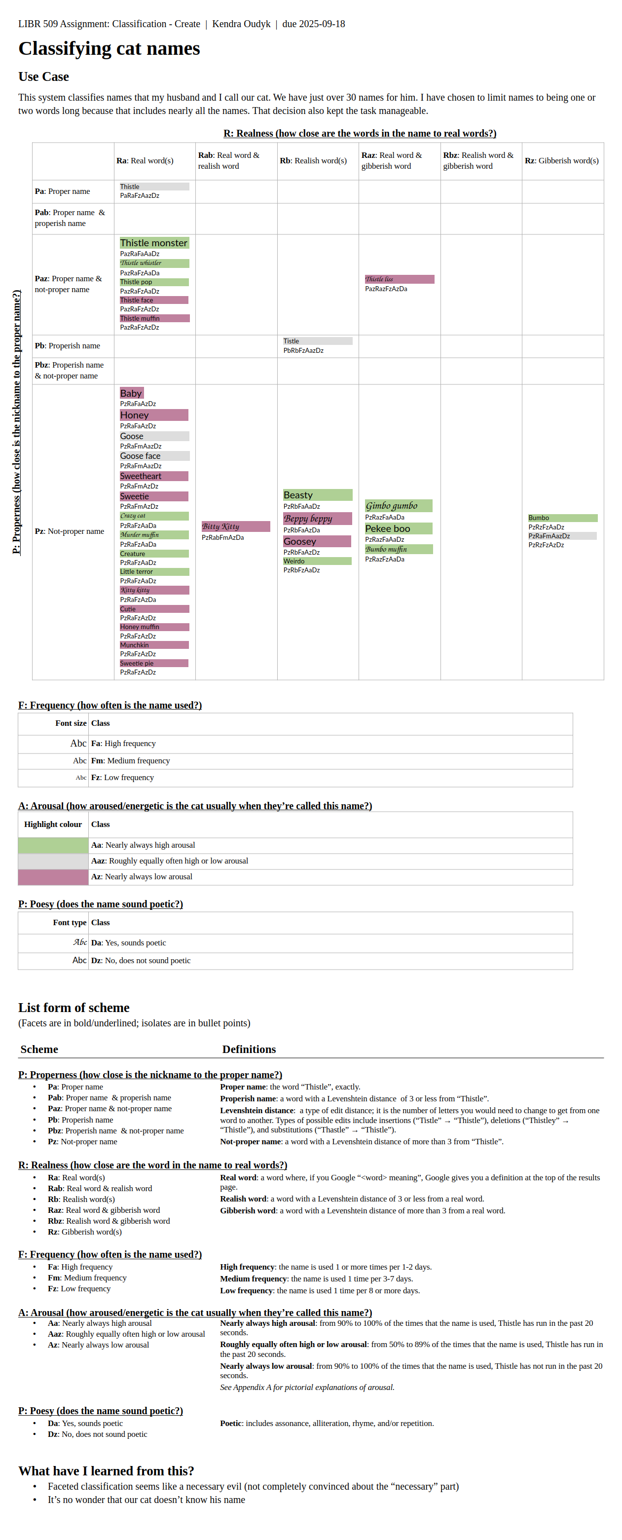 In this course about Organizing Things Well, we had to make a faceted classification system for a set of items of our choosing. I chose data visualizations, a special interest of mine. I stayed up way too late, my brain exploded, and Colin jokingly suggested I pick something simpler, like names we call our cat. Fine, I will be silly and maybe explode less and be able to sleep. The latter did not happen. I hated and loved it.